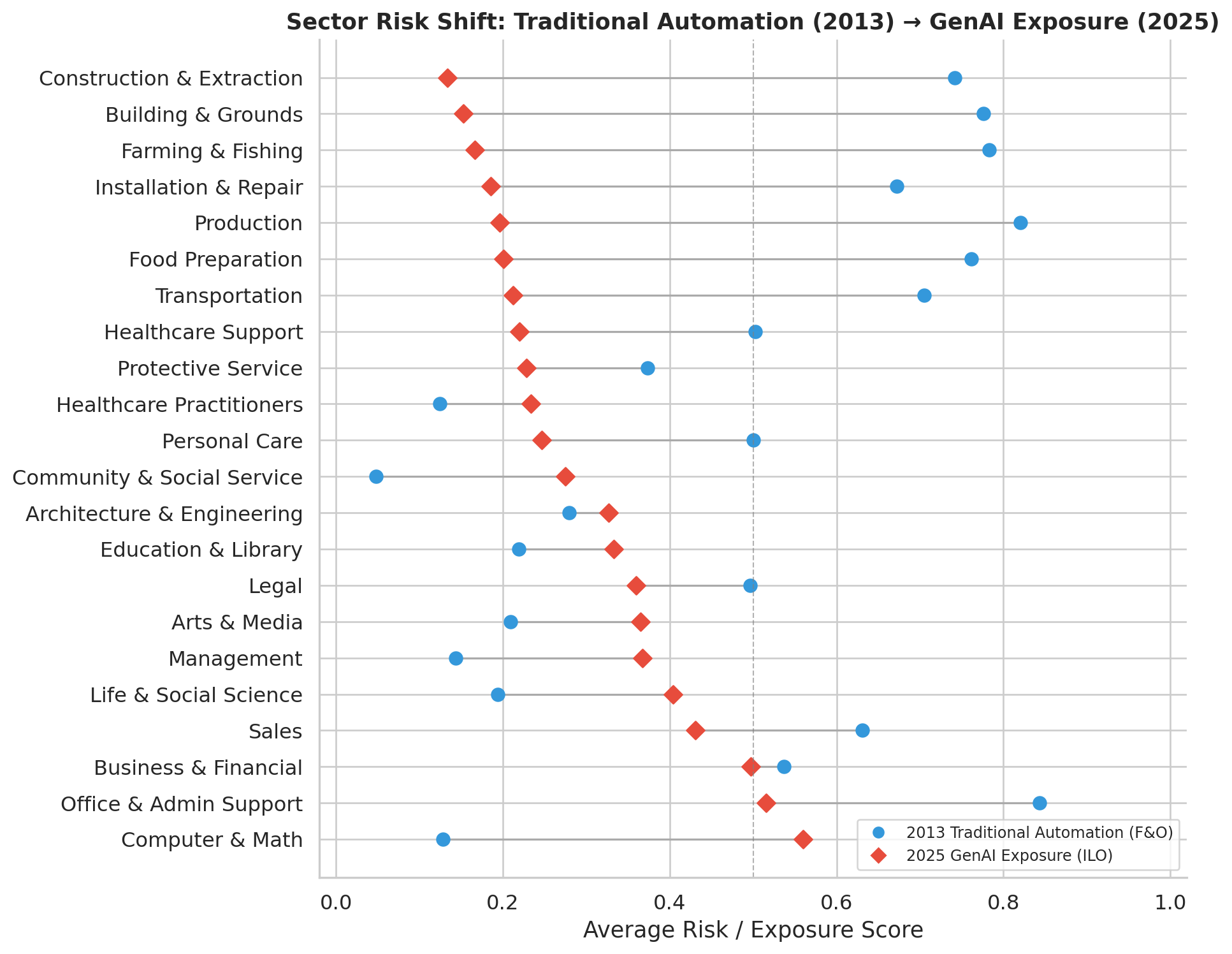 | Sector | 2013 Risk | 2025 GenAI Exposure | Δ |