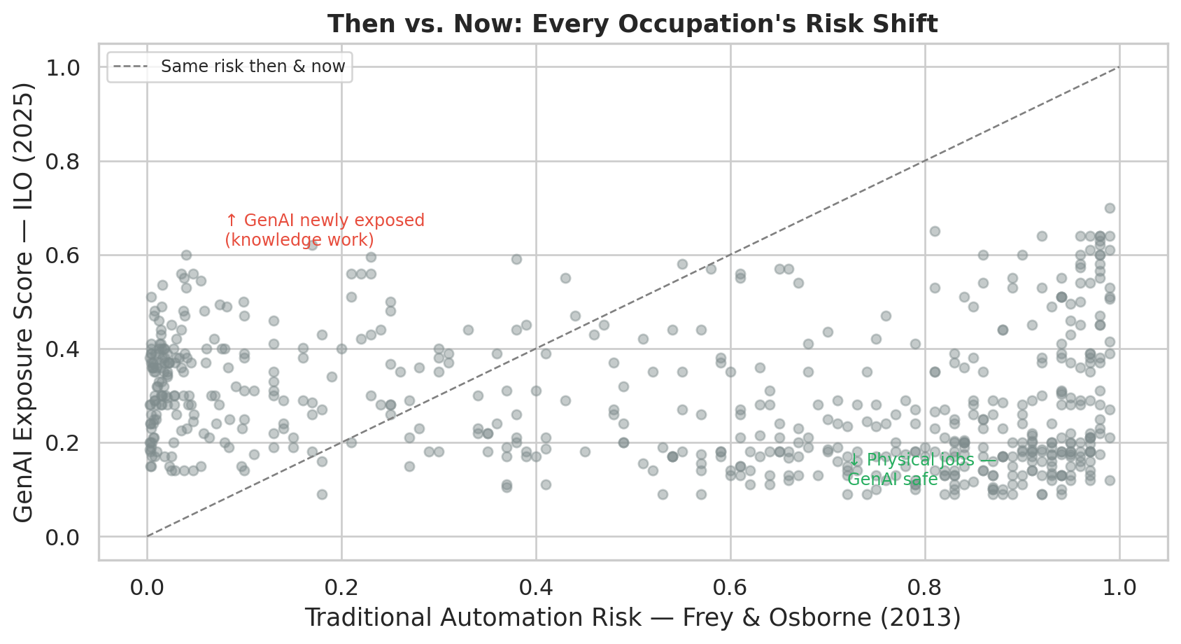 The scatter plot places every occupation against a diagonal reference line. Points above the diagonal were underestimated by 2013 models — they face more GenAI exposure than traditional automation suggested. Points below were overestimated — high traditional automation risk that GenAI does not replicate.
