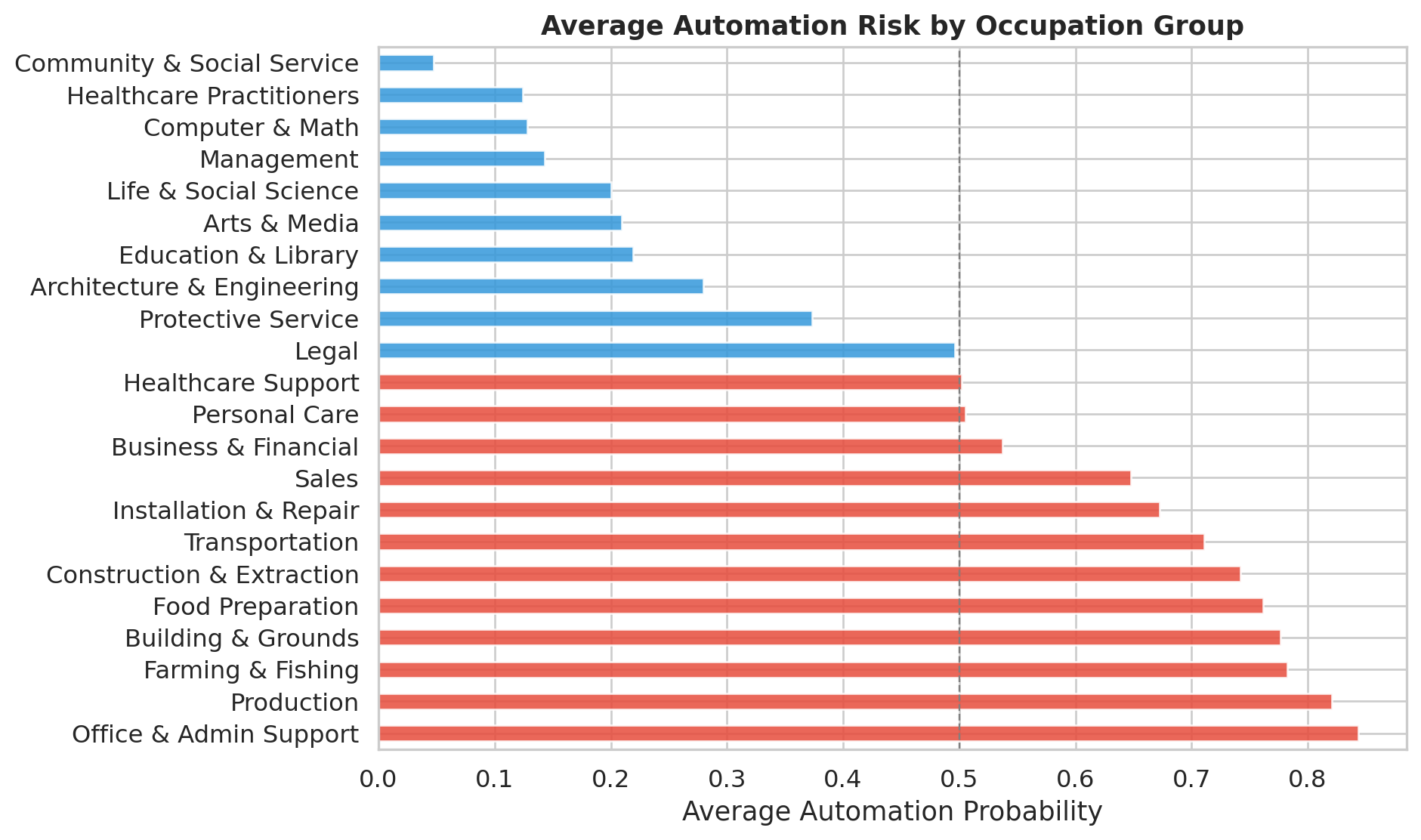By occupation group, the highest-risk sectors are Office & Administrative Support (84% average probability), Production (82%), Farming & Fishing (78%), and Building & Grounds (78%). The safest sectors are Community & Social Service (5%), Healthcare Practitioners (12%), Computer & Math (13%), and Management (14%).