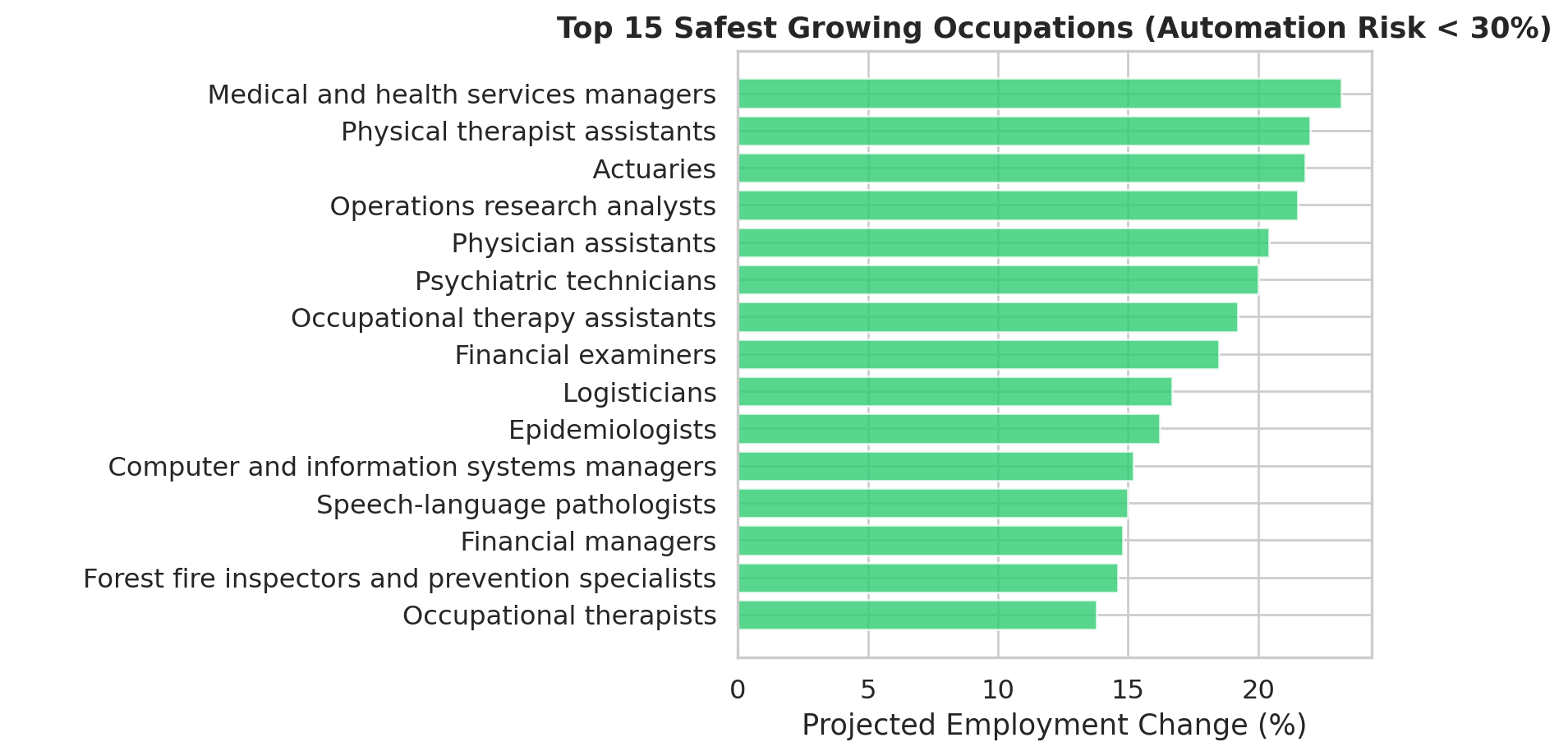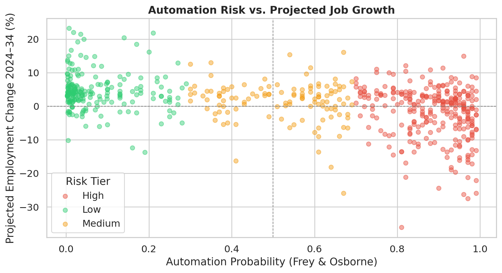 The scatter plot reveals the Automation Paradox visually. There is a clear negative trend — occupations with higher automation probability cluster toward the lower portion of the chart. But the relationship is wide and noisy. Many high-automation occupations still show positive projected employment growth. Automation risk is predictive but not deterministic.