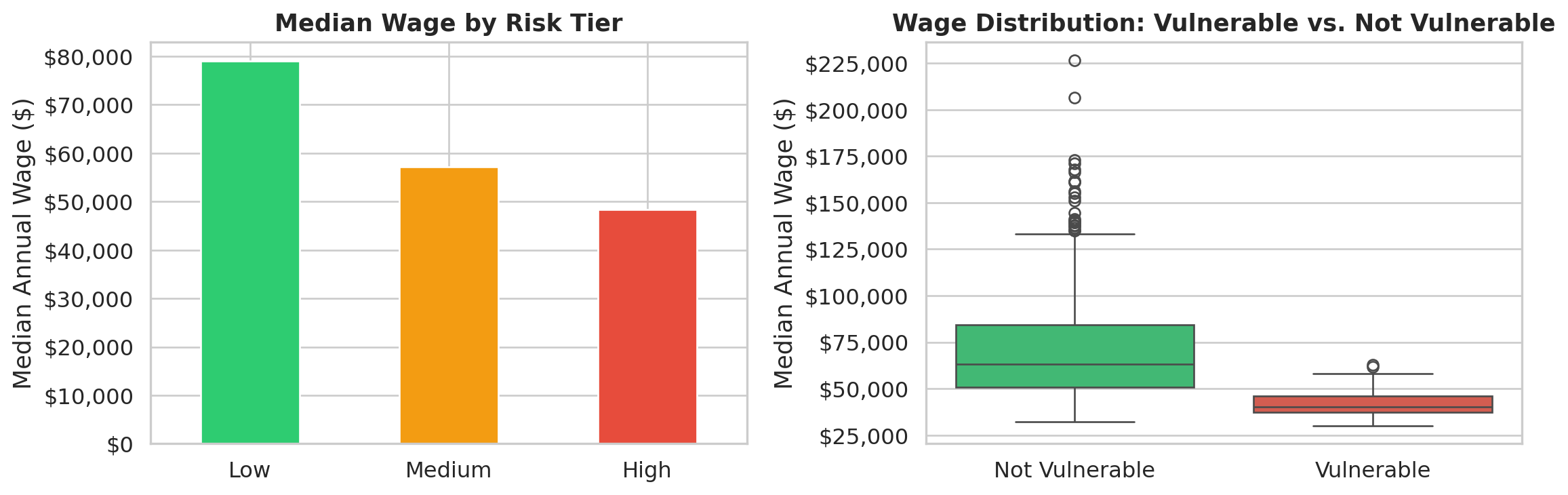 The wage data tells a stark story. High-risk occupations have a median annual wage of $48,350, compared to $79,000 for low-risk occupations — a $30,650 gap.
