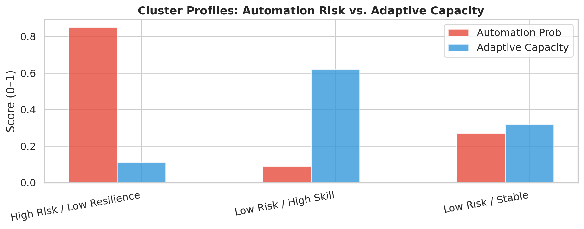 The “High Risk / Low Resilience” cluster — 50% of matched occupations — faces declining employment with virtually no adaptive buffer. The “Low Risk / High Skill” cluster — only 12% of occupations — enjoys near-zero automation risk, strong job growth, and wages 2.5× higher than the at-risk group.